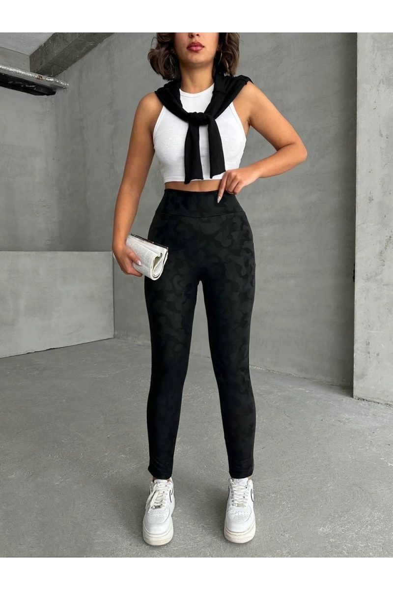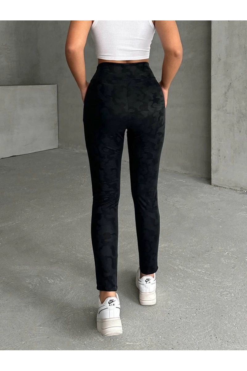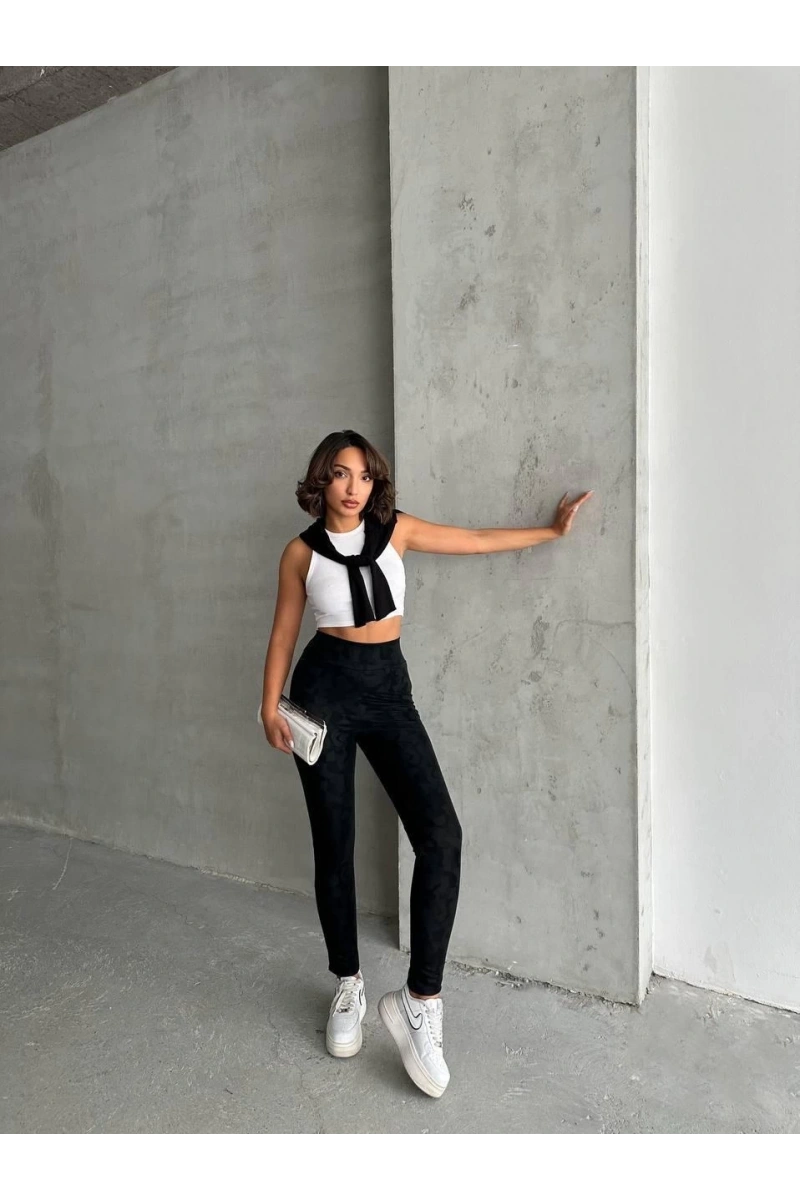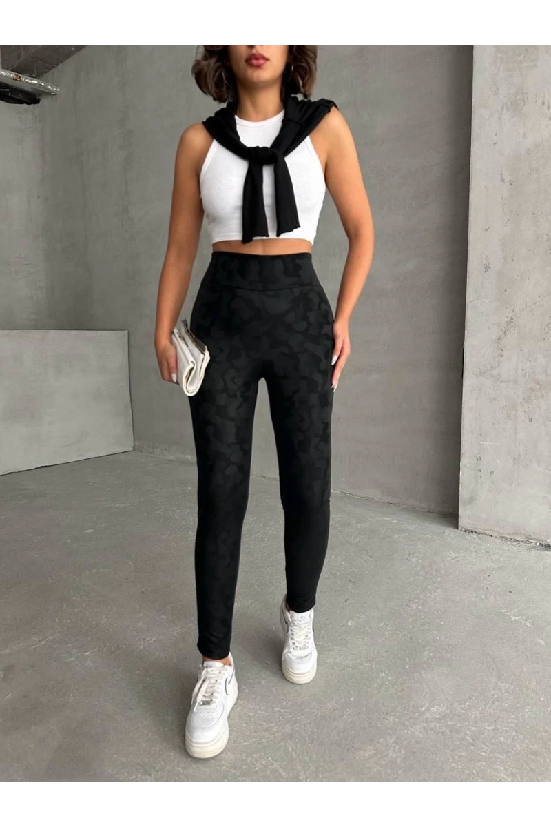 Trendleri takip eden kadınların favorisi olmaya aday, gizli yan fermuarlı bulut desenli siyah tayt ile şıklığı ve rahatlığı bir arada yaşayacaksınız.