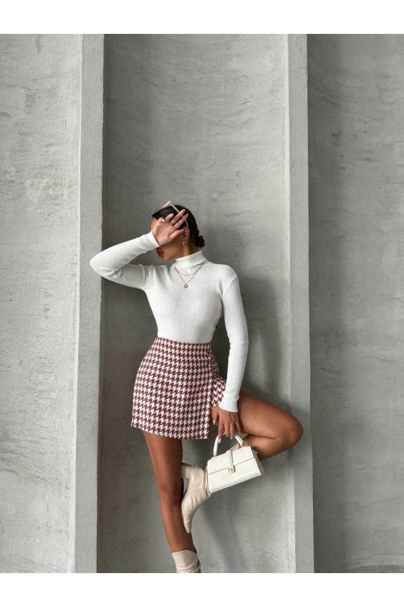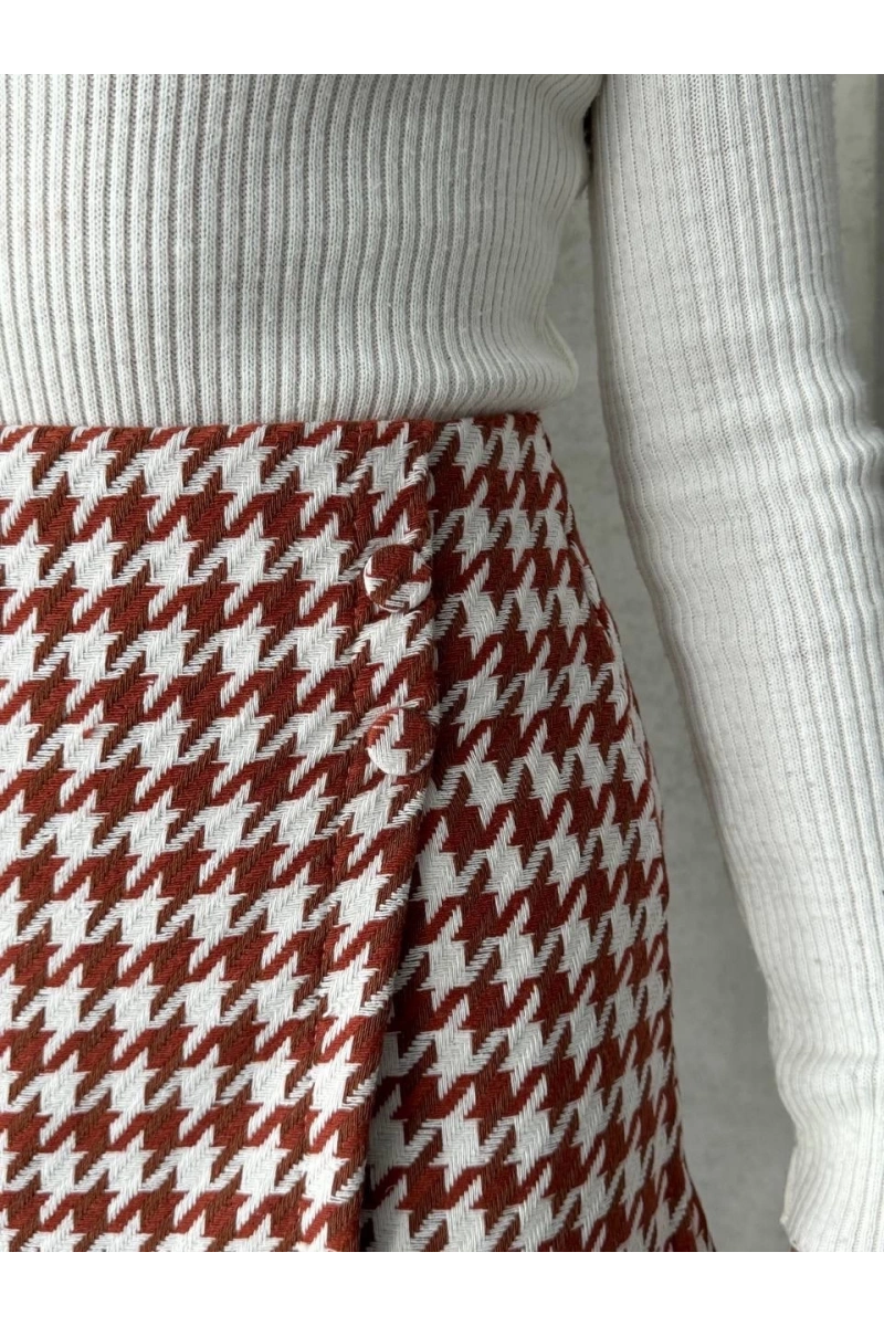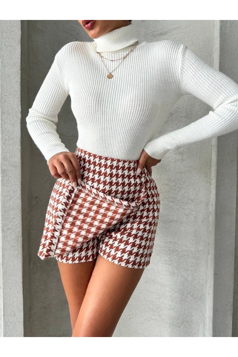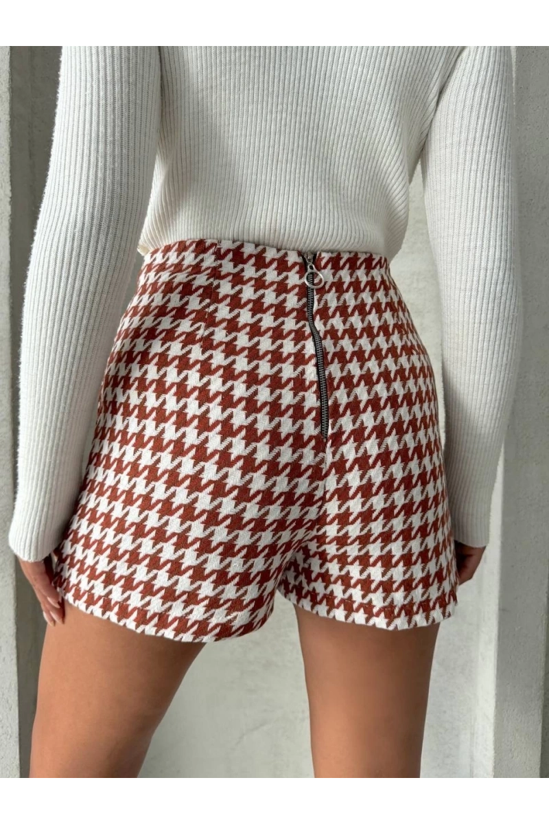 İki düğmeli kaz ayağı desen ch kumaş şort etek bordobeyaz h26414