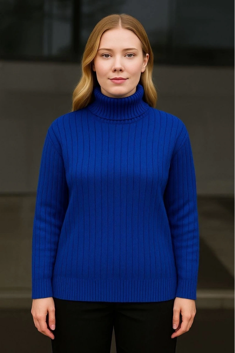 Kadın Balıkcı Yaka Bağazlı Triko Kazak Pamuklu Kalın Fitilli Dokuma - Saks Mavisi