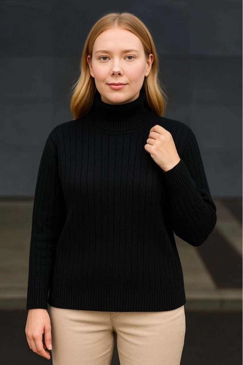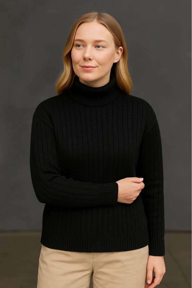 Kadın Balıkcı Yaka Bağazlı Triko Kazak Pamuklu Kalın Fitilli Dokuma - Siyah