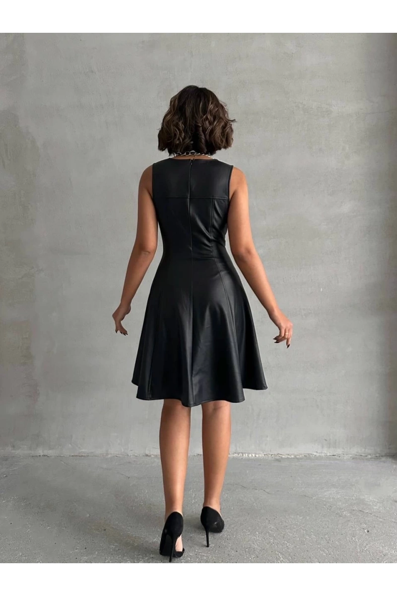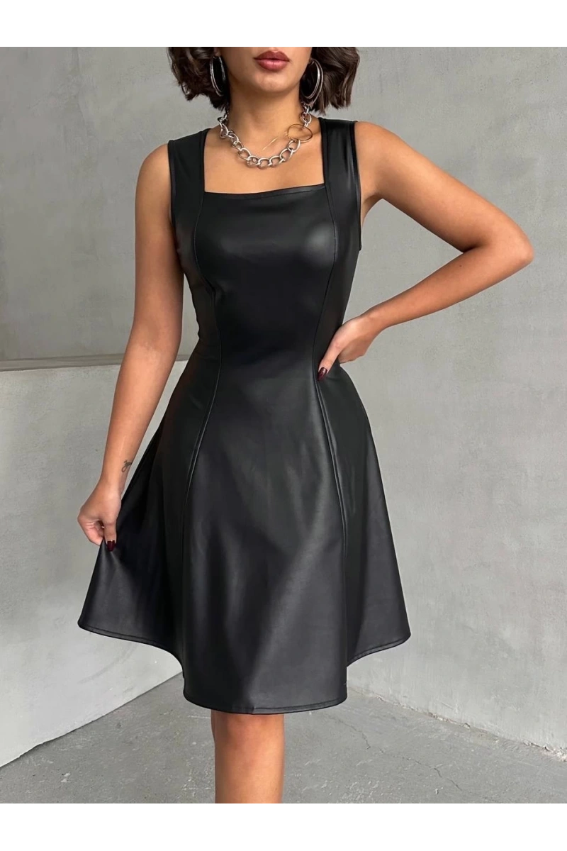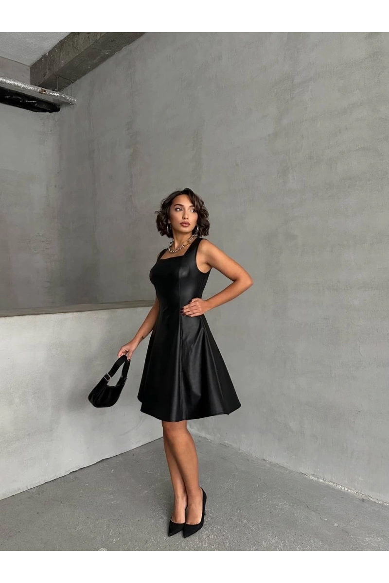 Şıklık ve zarafetin buluştuğu Kare Yaka Deri Elbise Siyah H24442, gardırobunuzun vazgeçilmezi olmaya aday!