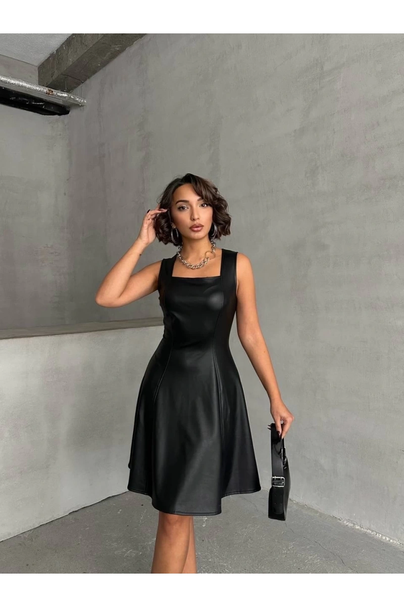 Kare yaka deri elbise siyah h24442