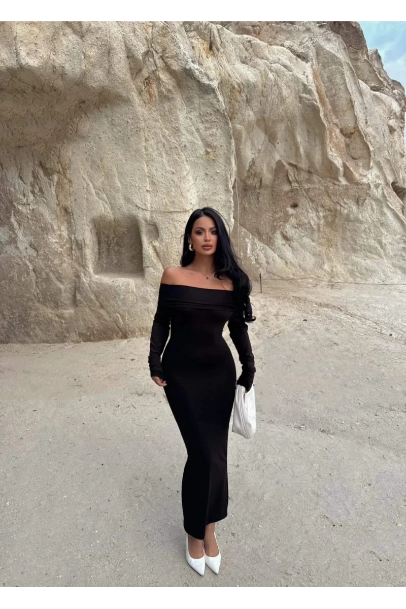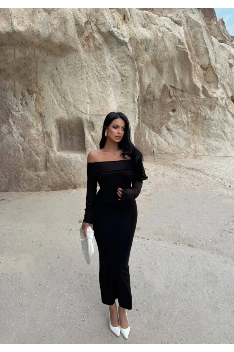 Madonna yaka esnek kumaş elbise siyah, gardırobunuzun vazgeçilmezi olmaya aday bir parça! Hem şık hem de rahat yapısı ile öne çıkan bu elbise, günün her saati şıklığınızı tamamlamak için ideal bir tercih.