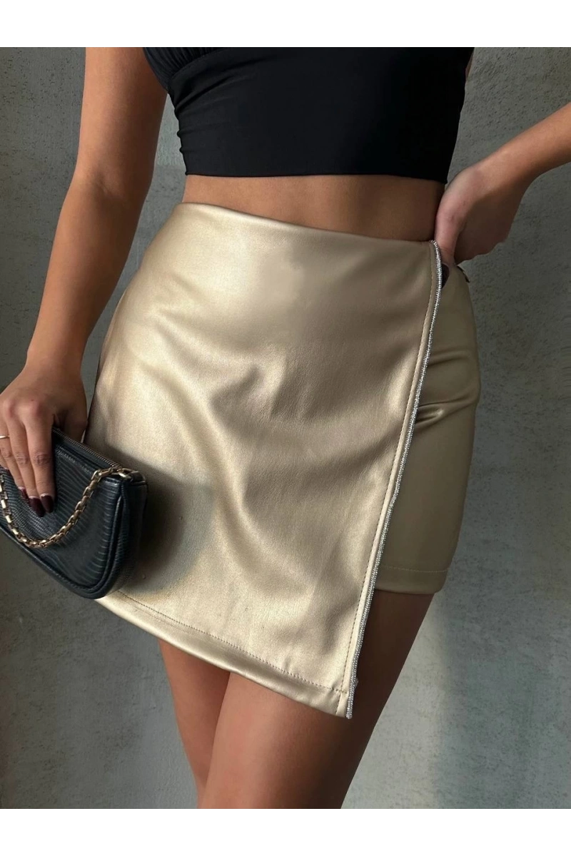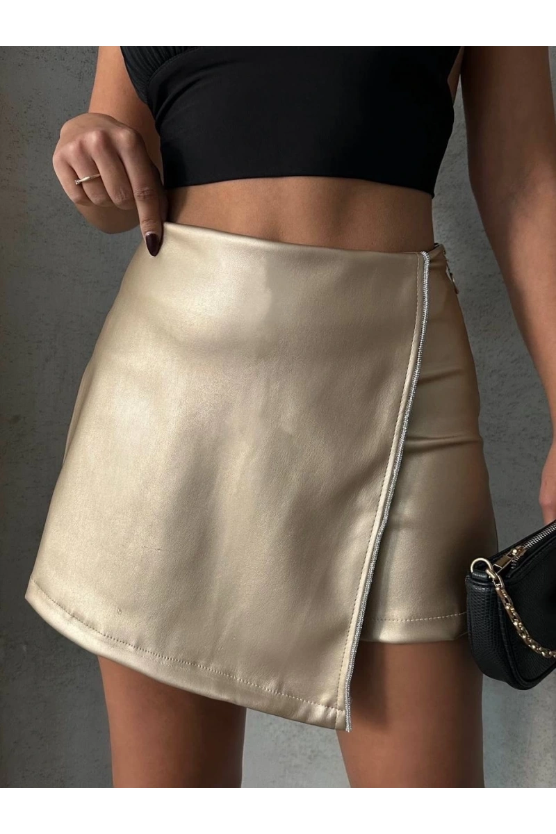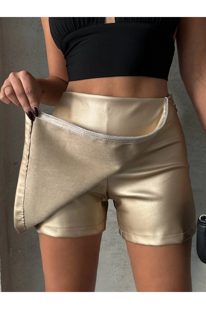 Şıklık ve rahatlığı bir arada sunan Taşlı Şort Etek Deri Gold H240018 ile tarzınızı konuşturun.