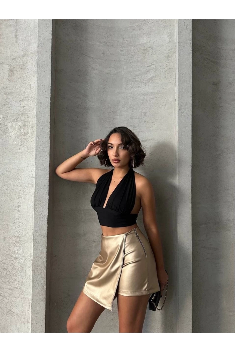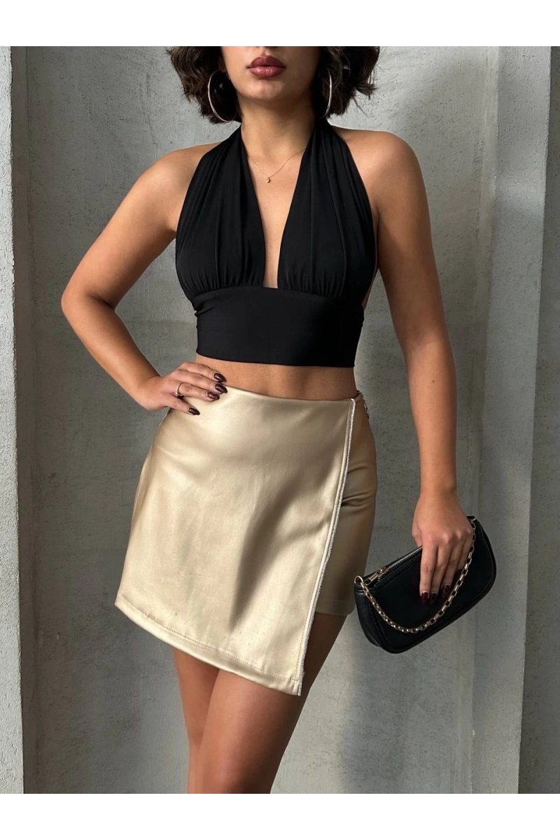 Şort etek modelleri arasında iddialı bir seçenek olan Taşlı Şort Etek Deri Gold H240018'i hemen sepetinize ekleyin!