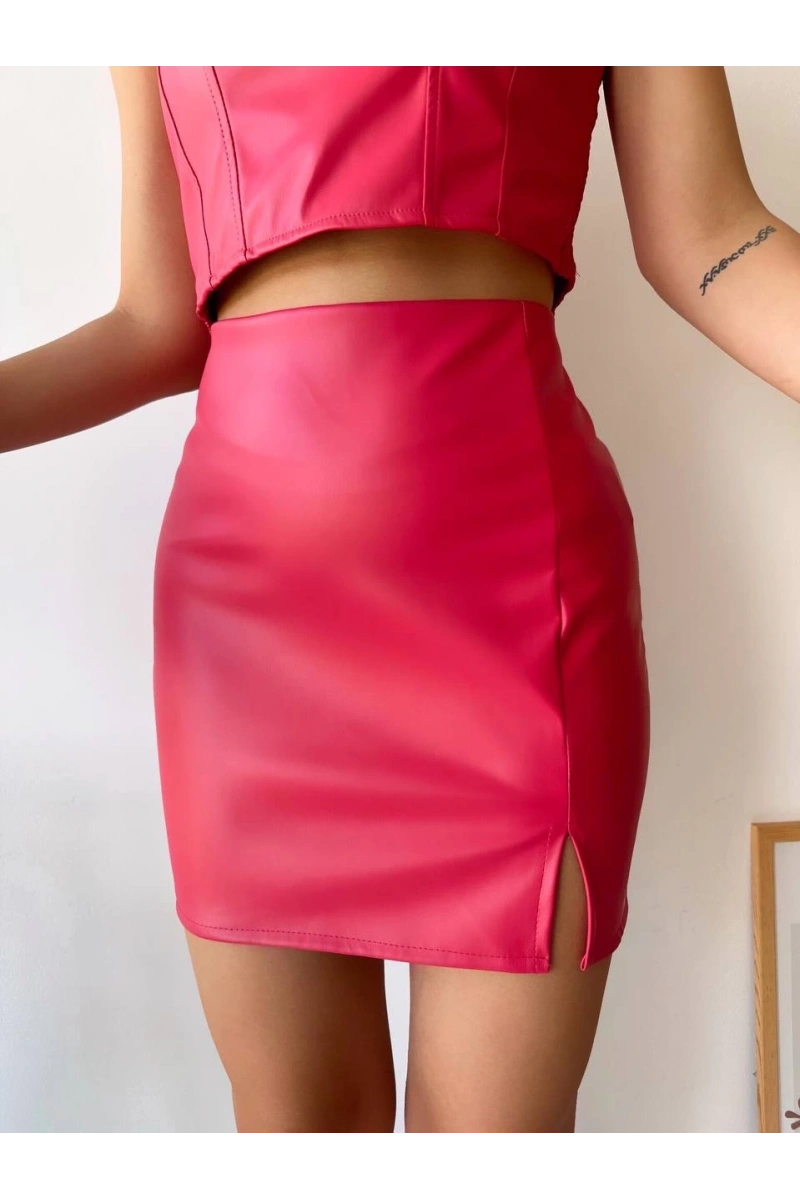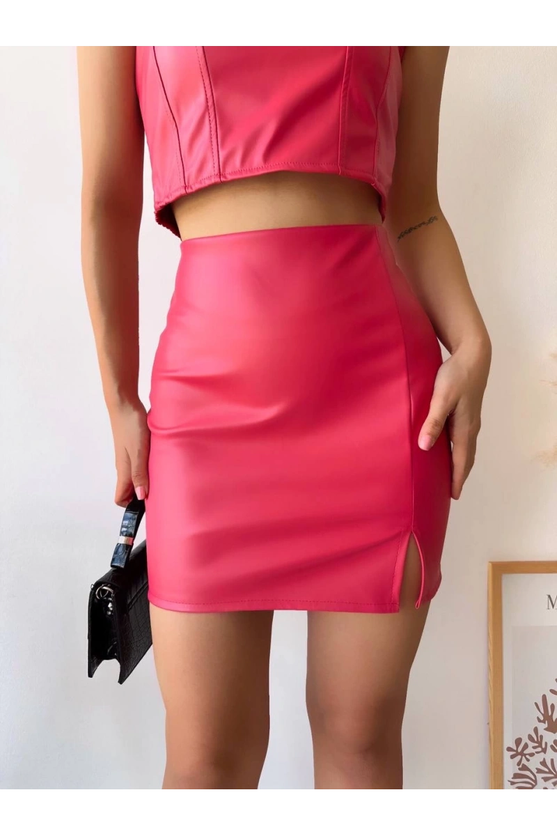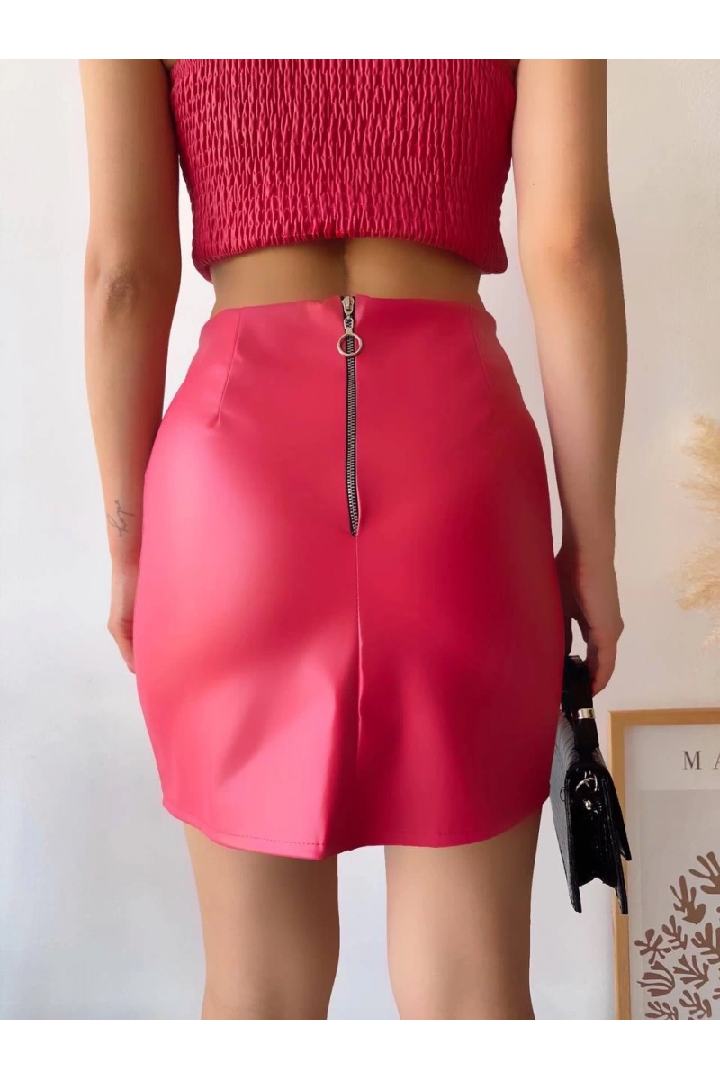 Tek yırtmaçlı arkadan fermuarlı deri etek fuşya s24475